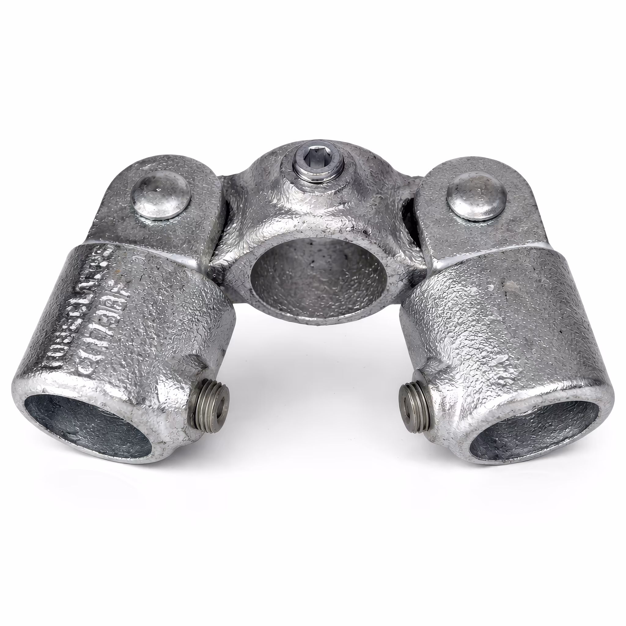 Versatile fitting with two swivel connections set at 180° to each other. Each swivel allows approximately 85° movement from the horizontal in both vertical directions. Tube cannot be joined within the fitting. Not designed to withstand lateral loads.